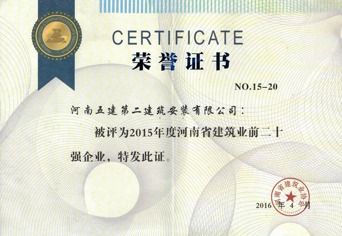 熱烈祝賀公司榮獲“2015年度河南省建筑業(yè)前二十強(qiáng)企業(yè)”