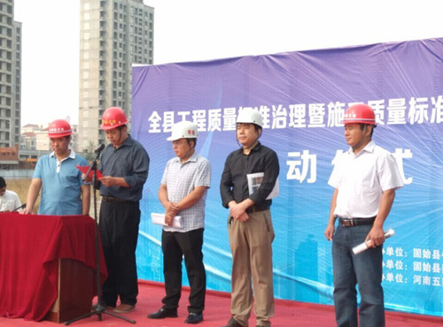 9月25日上午,由固始縣建設(shè)工程質(zhì)量監(jiān)督總站和固始縣建委承辦的全縣工程質(zhì)量標(biāo)準(zhǔn)治理暨施工質(zhì)量標(biāo)準(zhǔn)化觀摩活動啟動儀式在我公司承建的固始縣婦幼保健醫(yī)院項(xiàng)目施工現(xiàn)場隆重舉行。固始婦幼保健醫(yī)院業(yè)主、固始縣建設(shè)局、固始縣建設(shè)工程質(zhì)量監(jiān)督總站領(lǐng)導(dǎo)班子成員、固始各房地產(chǎn)開發(fā)公司負(fù)責(zé)同志以及縣各施工單位等有關(guān)人員共計(jì)200余人參加了儀式。