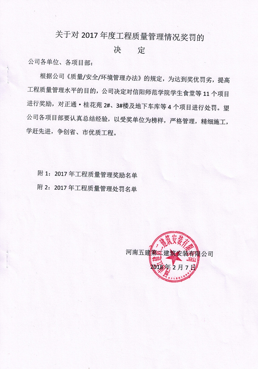 關(guān)于對2017年度工程質(zhì)量管理情況獎罰的決定