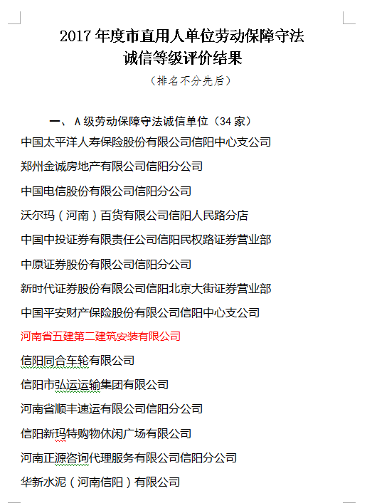 近日,信陽(yáng)市人力資源和社會(huì)保障局公布了《關(guān)于2017年度市直用人單位勞動(dòng)保障守法誠(chéng)信等級(jí)評(píng)價(jià)結(jié)果的公示》,我公司被評(píng)為A級(jí)勞動(dòng)保障守法誠(chéng)信企業(yè),這是公司連續(xù)多年獲評(píng)這一榮譽(yù),也是信陽(yáng)市唯一一家建筑施工企業(yè)獲此殊榮。
