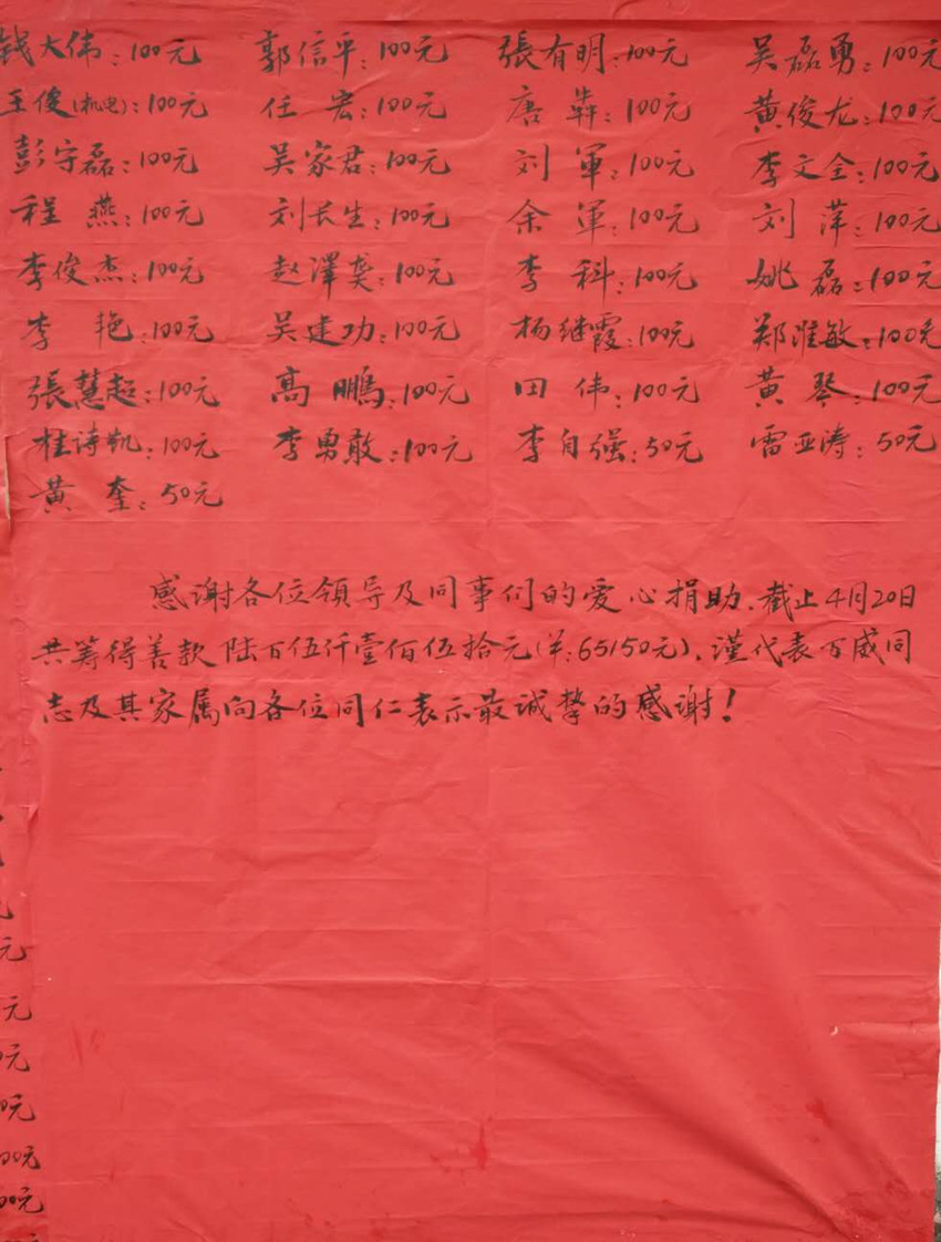 “一方有難,八方支援。”公司在得知萬(wàn)威身患重癥,家庭困難的情況后,立即組織員工開展“送溫暖、獻(xiàn)愛心”募捐活動(dòng)。公司全體員工紛紛伸出援助之手,踴躍捐款,慷慨解囊,共捐款65150元。
