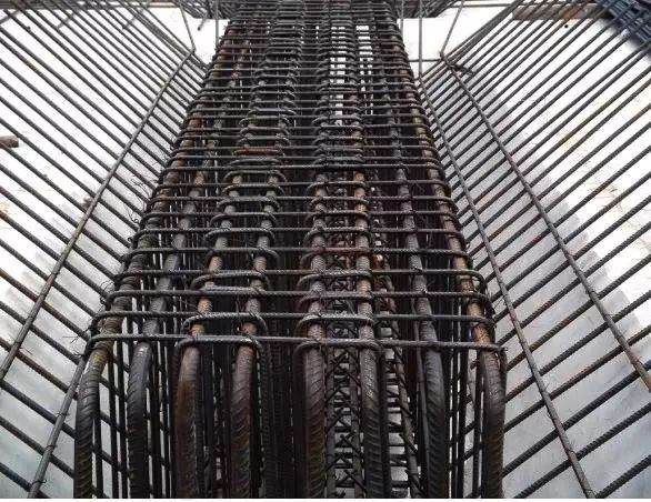 5、角部豎向鋼筋彎勾與模板成45度角,中間鋼筋彎勾與模板成90度角。