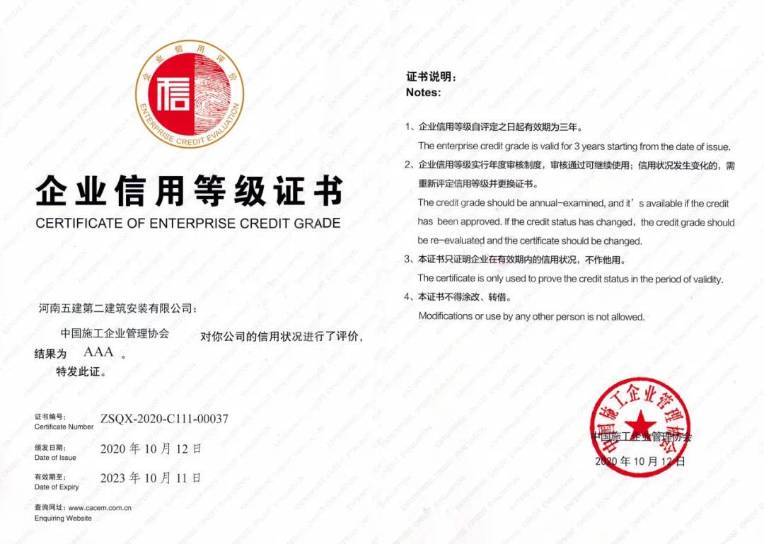 中國(guó)施工企業(yè)管理協(xié)會(huì)AAA級(jí)信用等級(jí)證書(shū)