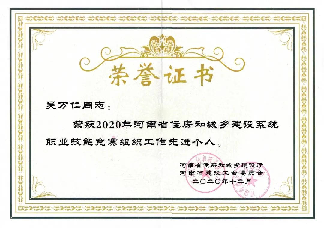 一分耕耘一分收獲,得益于積極的組織以及在競(jìng)賽中取得的優(yōu)異成績,公司榮獲“2020年河南省住房和城鄉(xiāng)建設(shè)系統(tǒng)職業(yè)技能競(jìng)賽組織工作先進(jìn)單位”稱號(hào)、吳萬仁董事長榮獲“2020年河南省住房和城鄉(xiāng)建設(shè)系統(tǒng)職業(yè)技能競(jìng)賽組織工作先進(jìn)個(gè)人”稱號(hào)。