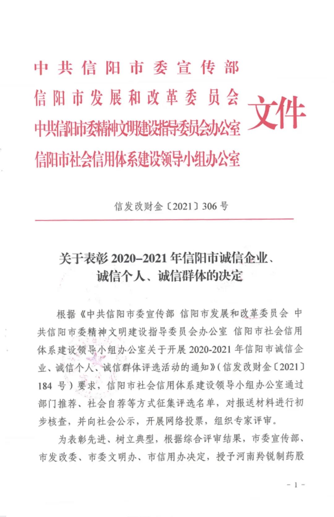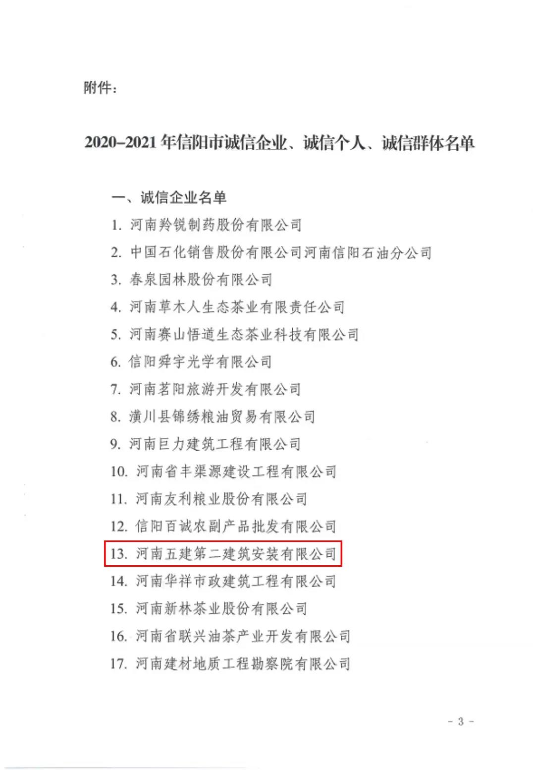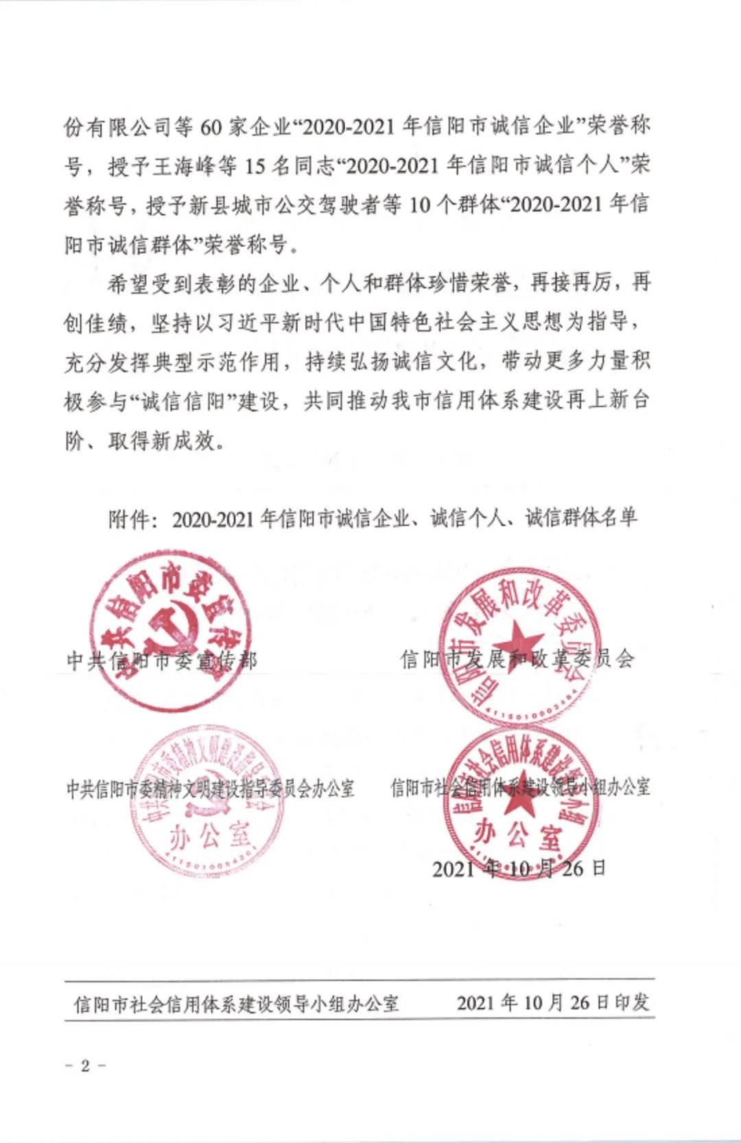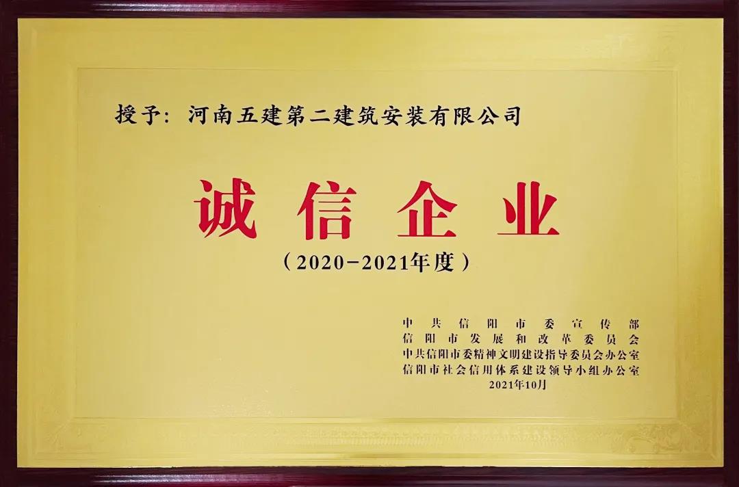 河南五建二公司榮獲2020-2021年信陽市“誠(chéng)信企業(yè)”榮譽(yù)稱號(hào)