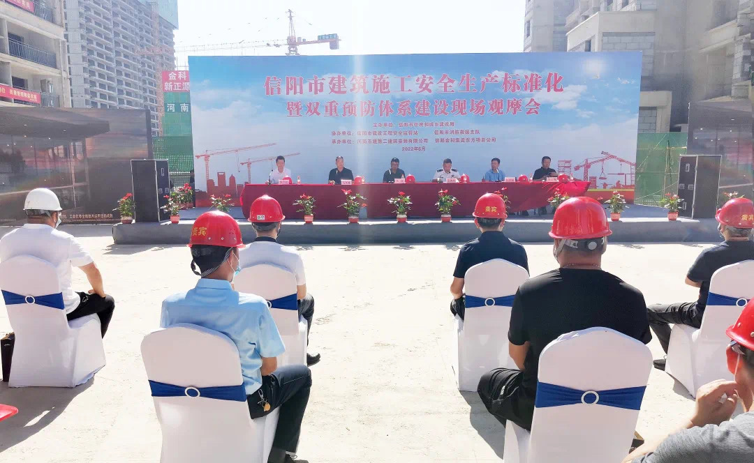 為深入開展全國第21個“安全生產(chǎn)月”活動,提高工程施工安全標(biāo)準(zhǔn)化水平,推進雙重預(yù)防體系建設(shè)工作,6月16日上午,信陽市建筑工程安全生產(chǎn)標(biāo)準(zhǔn)化暨雙重預(yù)防體系現(xiàn)場觀摩會在我公司金科集美東方項目現(xiàn)場隆重舉行。市住建局黨組成員、總規(guī)劃師張立、市消防救援支隊副支隊長王秀春、建管科科長陳志國、安監(jiān)站站長馬其峰及高新區(qū)住建局局長張彥偉等領(lǐng)導(dǎo)參加活動。公司黨委書記、董事長、總經(jīng)理吳萬仁受邀出席活動并講話。整場活動由會議階段、演練階段和觀摩階段三部分組成,由安監(jiān)站站長馬其峰負責(zé)主持。